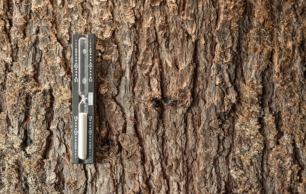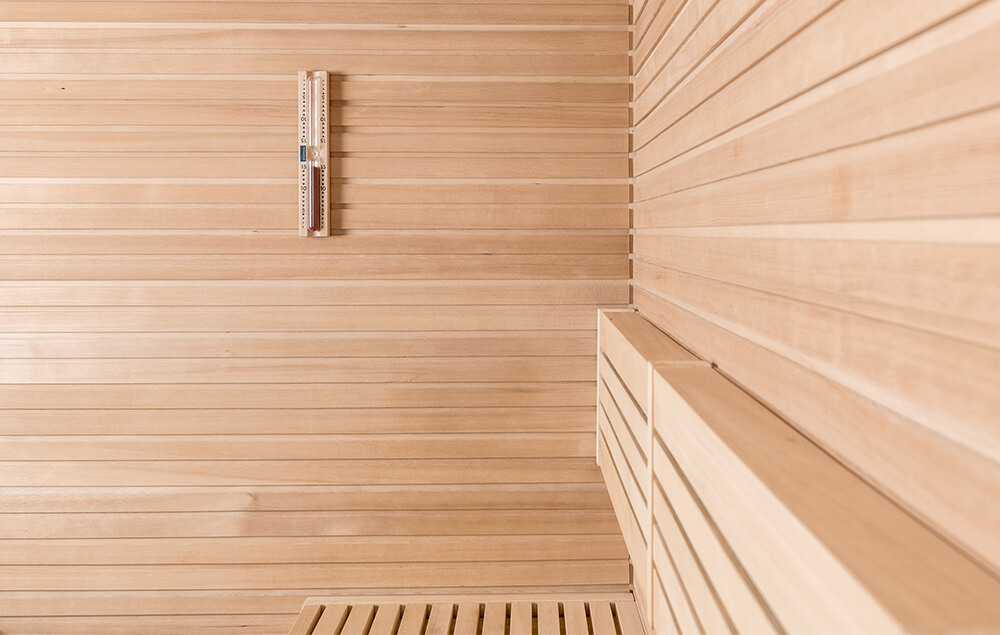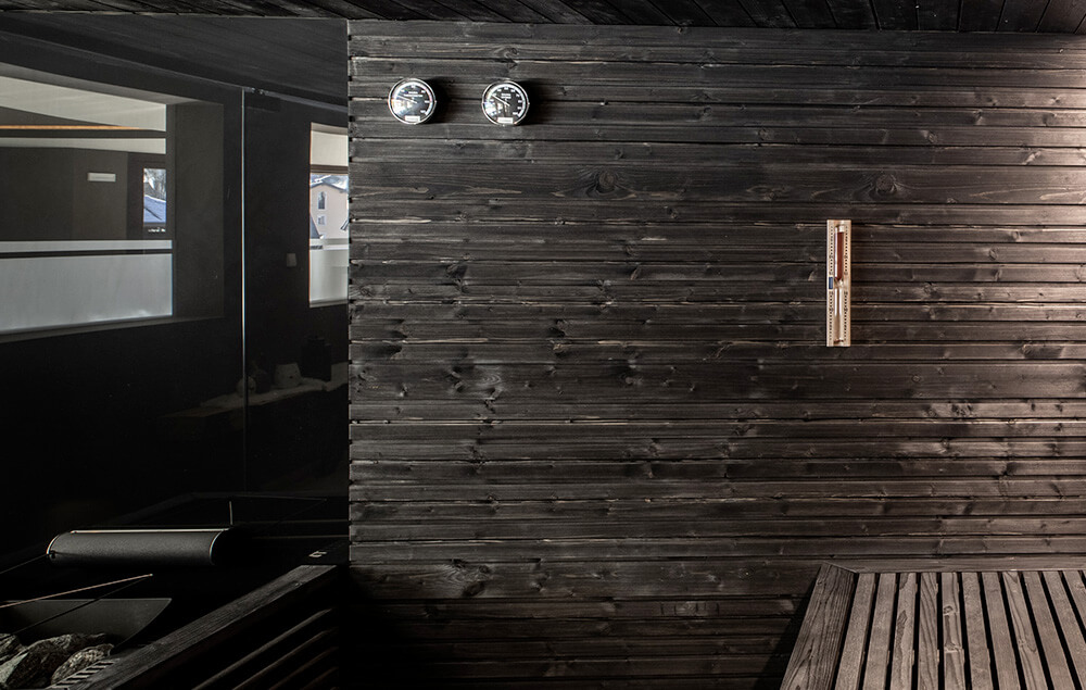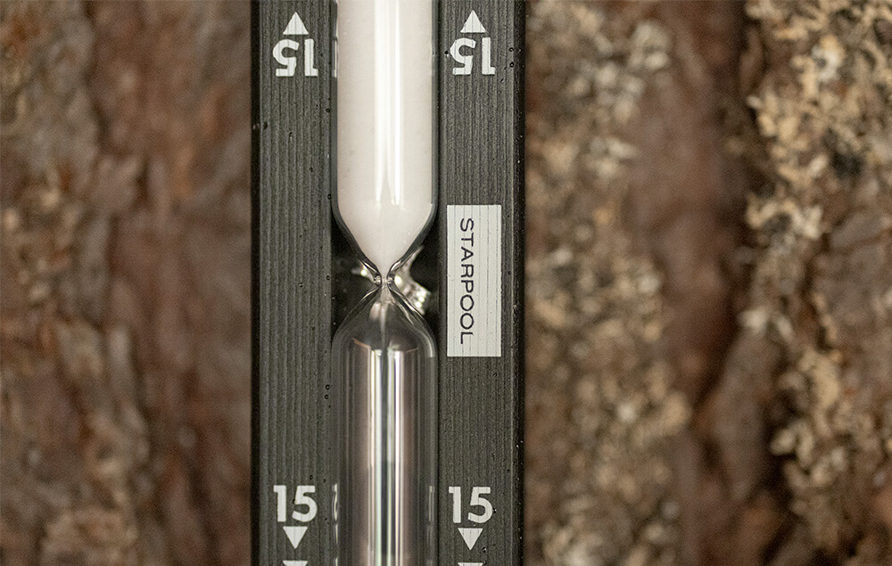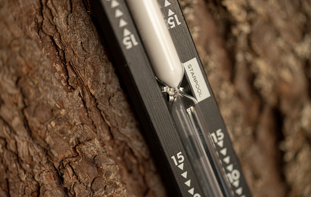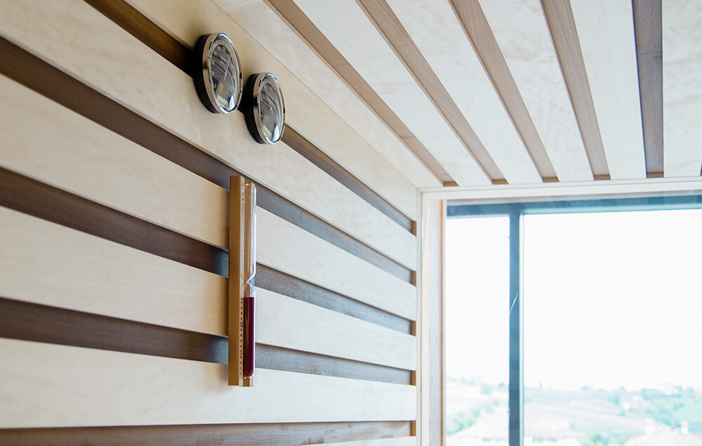 15-minute hourglass timer, resistant to high temperatures, with an elegant wooden frame to hang it to wall. This accessory signals the passing of minutes inside the cabin, allowing the guest to relax without losing track of time.