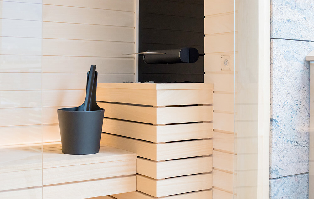 Biocomposite sauna bucket and ladle. Neat lines and Scandinavian design in a high-performance item. This natural-fibre composite material is durable and soft to the touch. It offers extraordinary stability to heat and humidity.